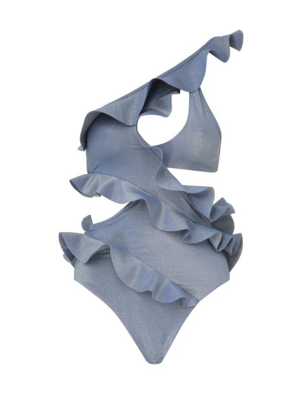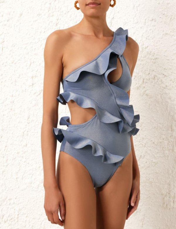 The August Asymmetric Frill 1PC in Dusty Blue from our Resort Swim 2024 Collection. A lurex lycra one piece featuring bonded frills and boning in the side seams.