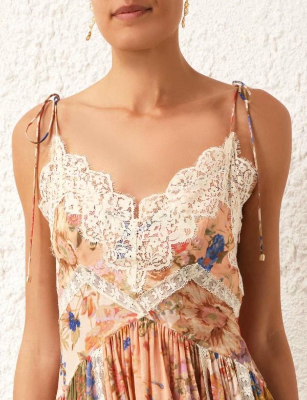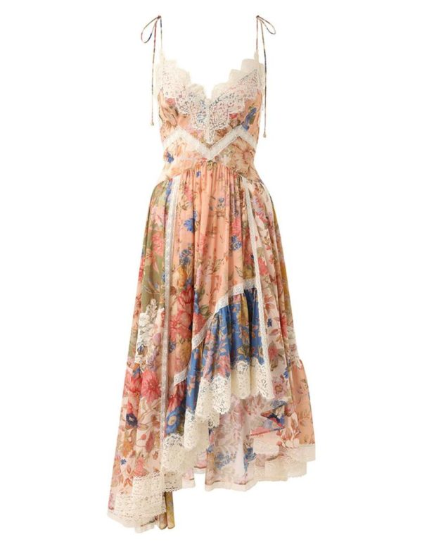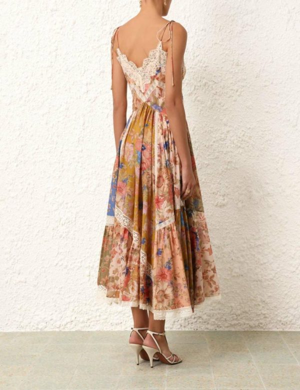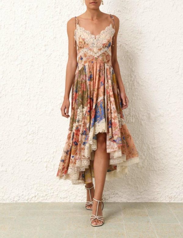 The August Asymmetric Slip Dress in Spliced from our Resort Swim 2024 Collection. A midi dress featuring an asymmetrical spliced skirt with trims throughout.
