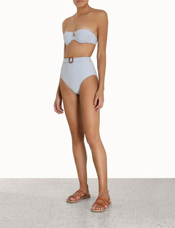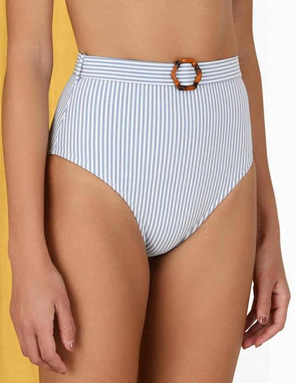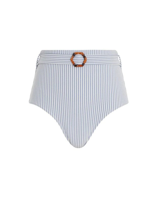The Chintz Stripe High Waist Pant in Cream/Blue Stripe from our Summer Swim 2023 Collection. A high waisted bikini pant constructed from Italian lycra featuring a removable self cover belt with a tortoiseshell buckle.