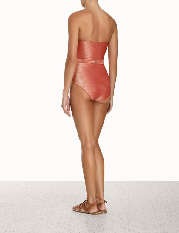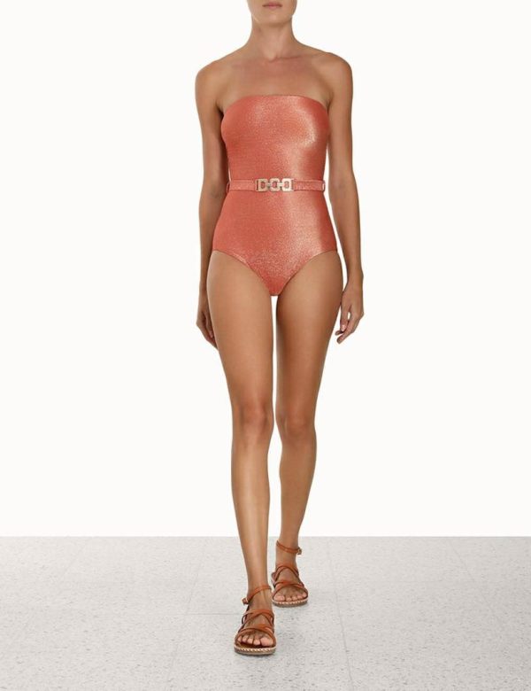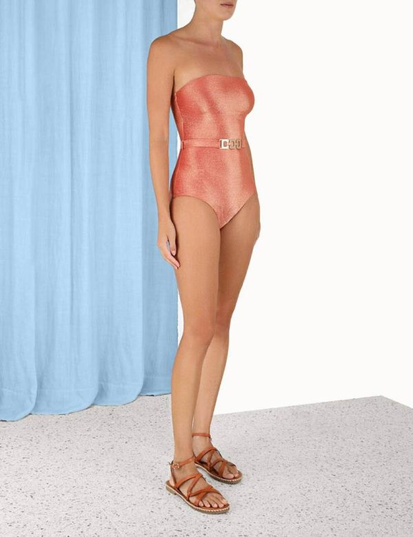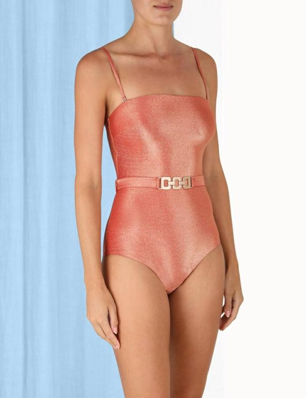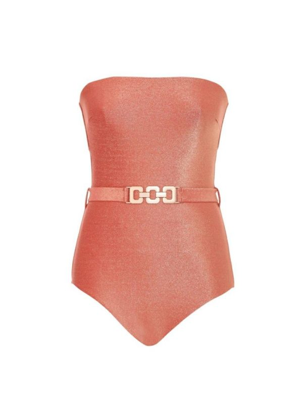The Devi Lurex Chain Link 1PC in Coral from our Summer Swim 2023 Collection. A lurex lycra bandeau one piece featuring boning in the side seams, a shelf bra and a removable self cover belt with chain link detailing.