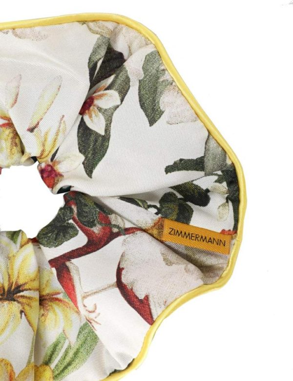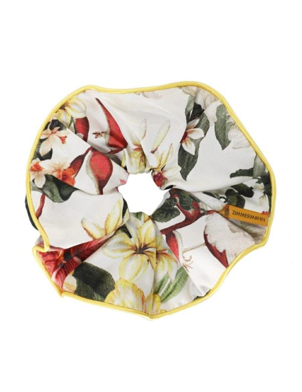 The Double Faced Silk Scrunchie in Ivory Palm from our Resort 2024 Collection, Matchmaker. A silk scrunchie featuring contrast piped edges.