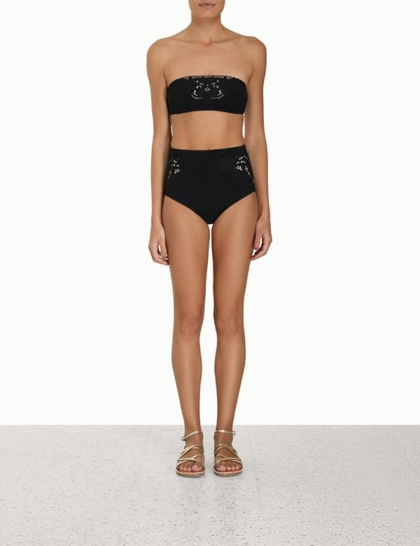The Ginger Embroidered Bikini in Noir from our Summer Swim 2023 Collection. A lycra bikini featuring placement embroidery, nude mesh lining, side seam boning in the bra, and a high waisted pant.