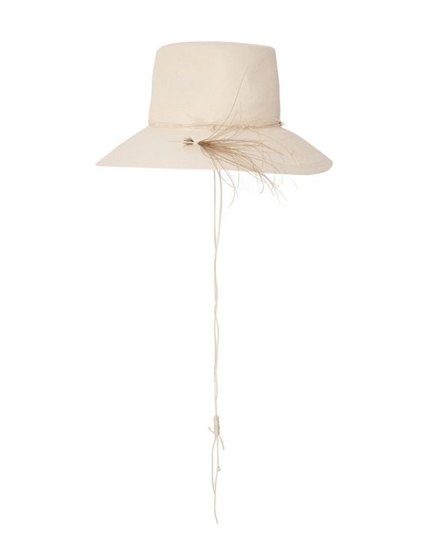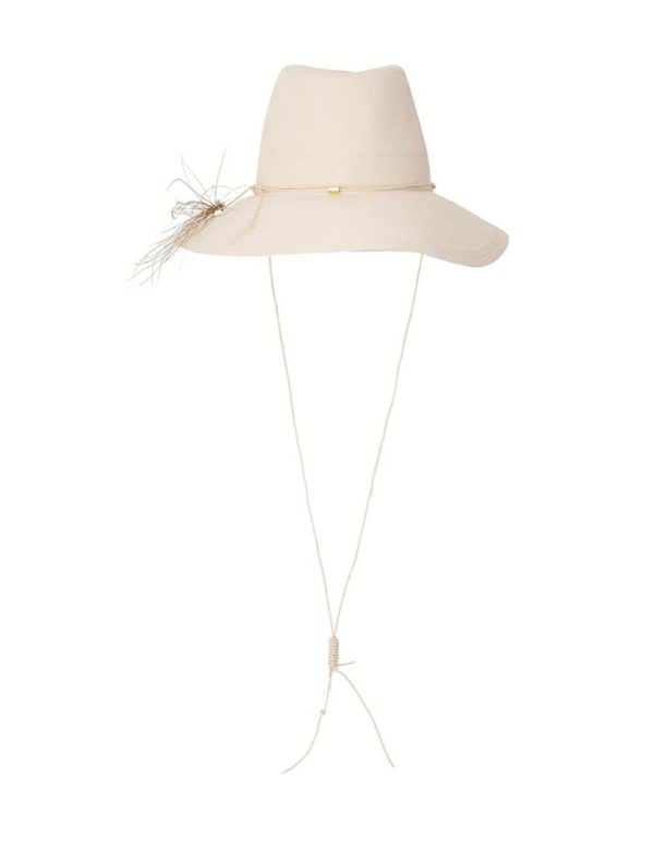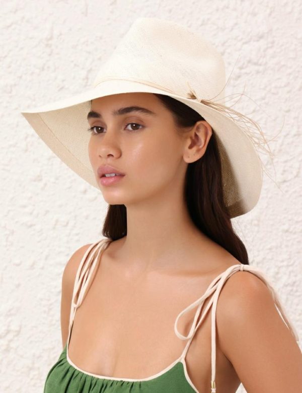 The Glazed Straw Collapsible Hat in Natural from our Resort 2024 Collection, Matchmaker. A straw hat featuring a feather trim.