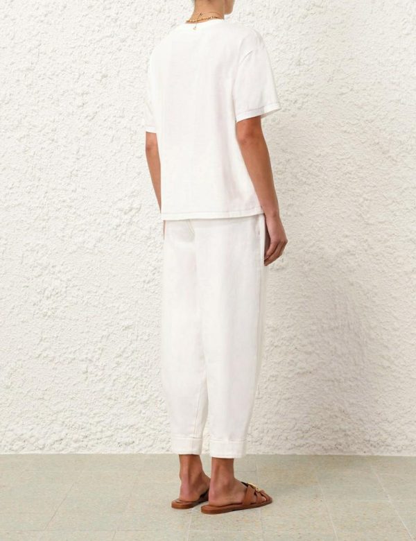 The Junie Denim Utility Pant in Vintage White from our Resort Swim 2024 Collection. A vintage white denim jean featuring wide belt loops and a utility style silhouette.