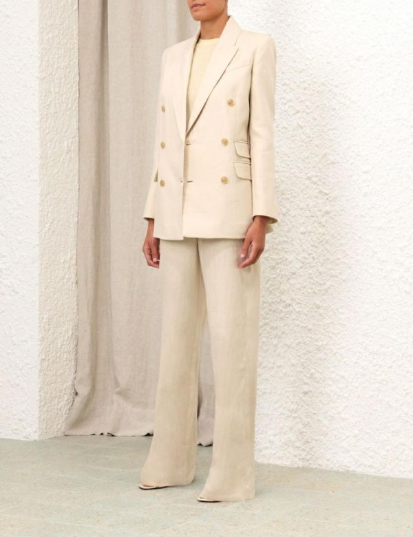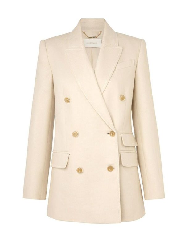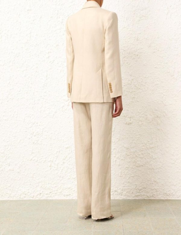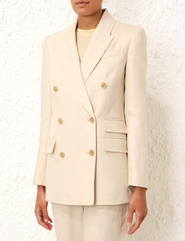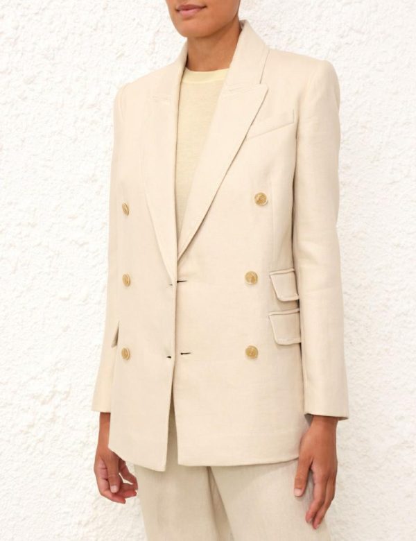 The Matchmaker Tailored Jacket in Straw from our Resort 2024 Collection, Matchmaker. A linen blazer featuring zig zag top stitching throughout, functional pockets with jets, and buttons at the front opening.