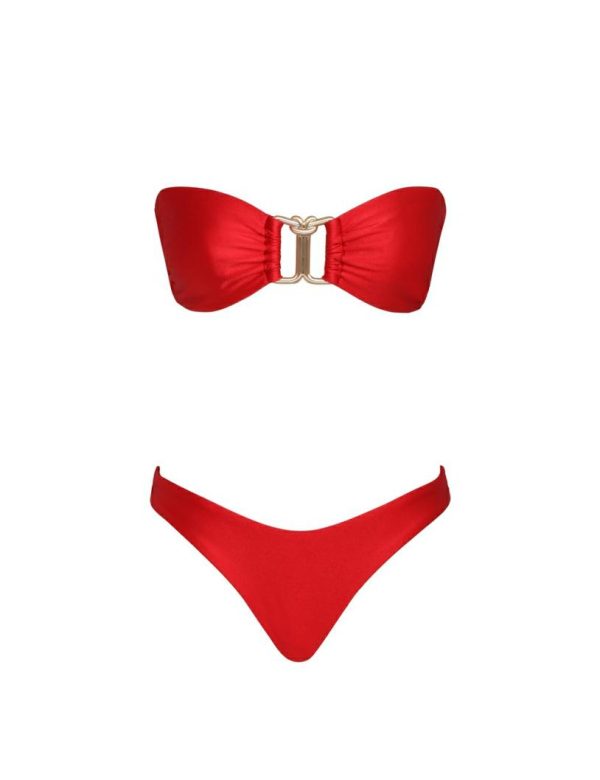 The Raie Knot Trim Bikini in Bright Coral from our Summer Swim 2023 Collection. A lycra bikini featuring boning in the bra, removable straps and a clip back.