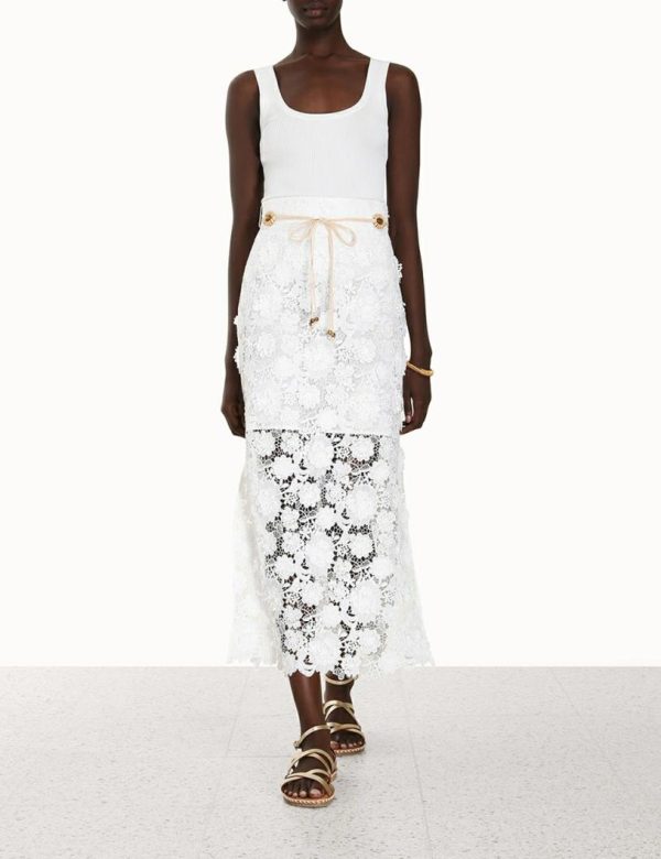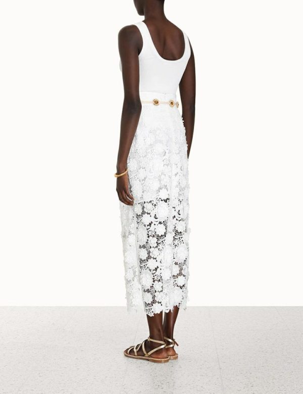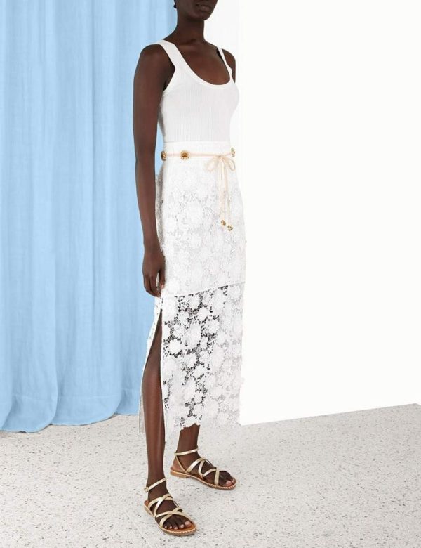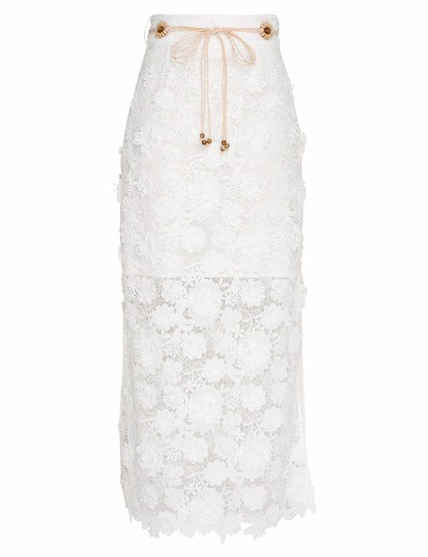 The Raie Lace Flower Skirt in Ivory from our Summer Swim 2023 Collection. A lace midi skirt featuring a scallop edge hem and a side belt chain loops.