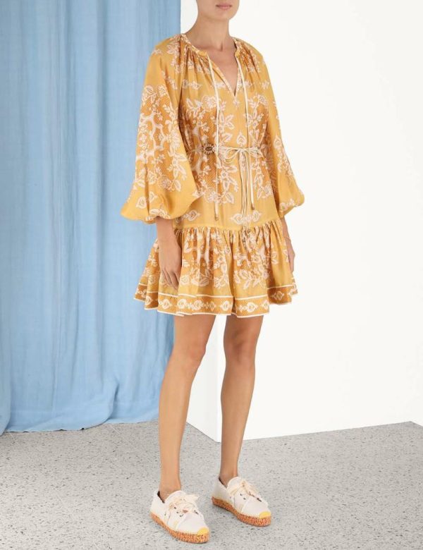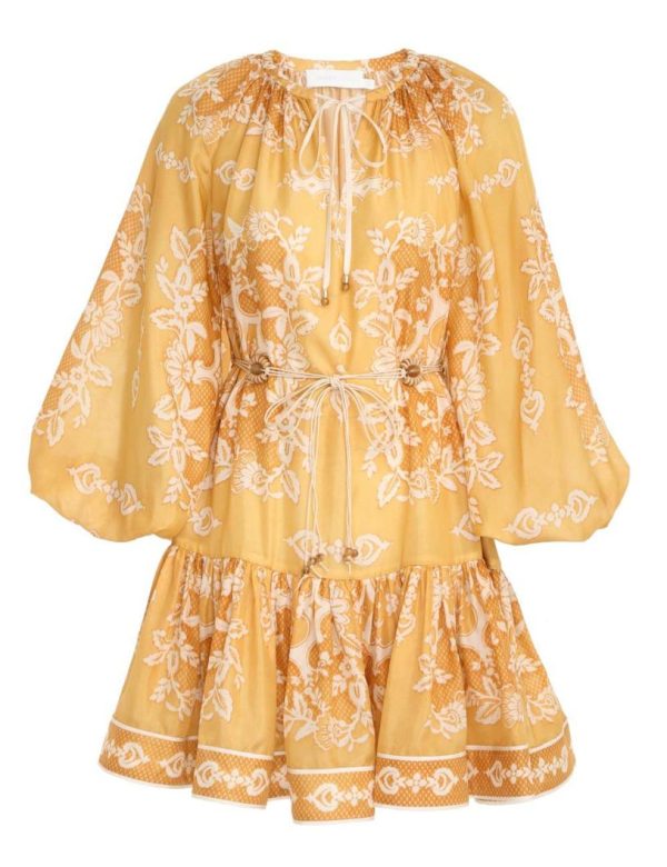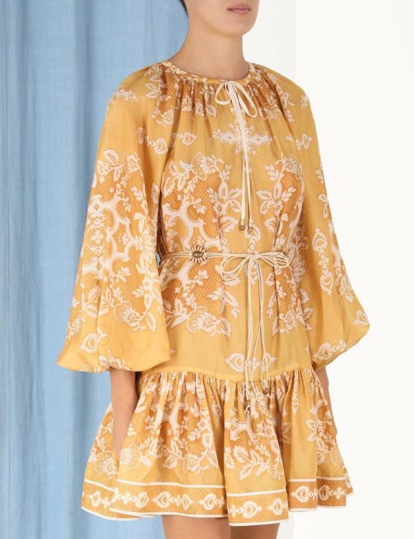 The Raie Tiered Billow Mini Dress in Gold Damask from our Summer Swim 2023 Collection. A silk mini dress featuring a drawstring neckline with a self tie neck tie, elasticated sleeves and a removable belt.