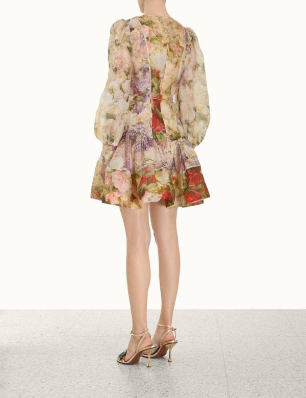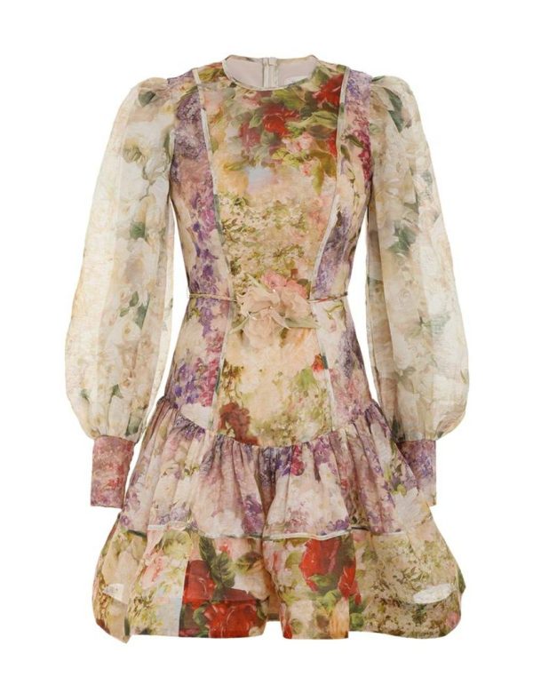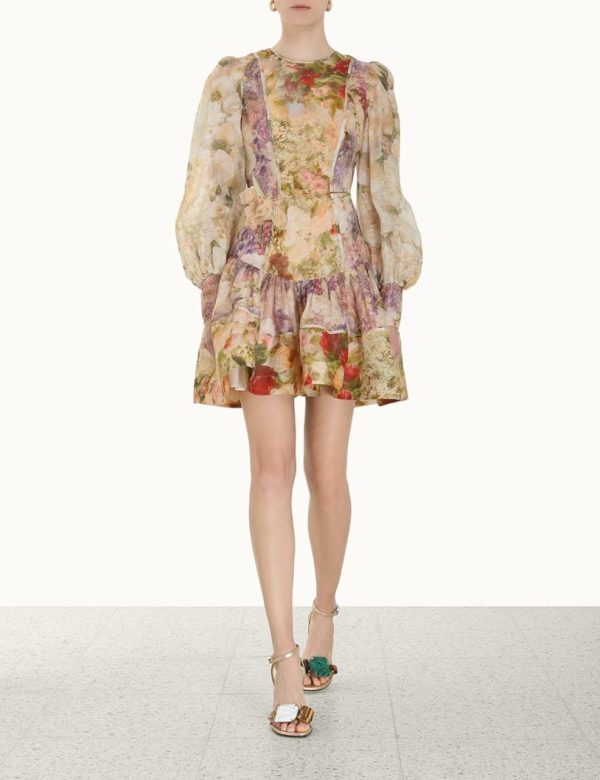 The Sensory Flip Dress in Multi Spliced Floral from our Fall 2023 Collection, Luminosity. A silk linen mini dress featuring blouson sleeves and a drop waist, finished with a floral applique tie.