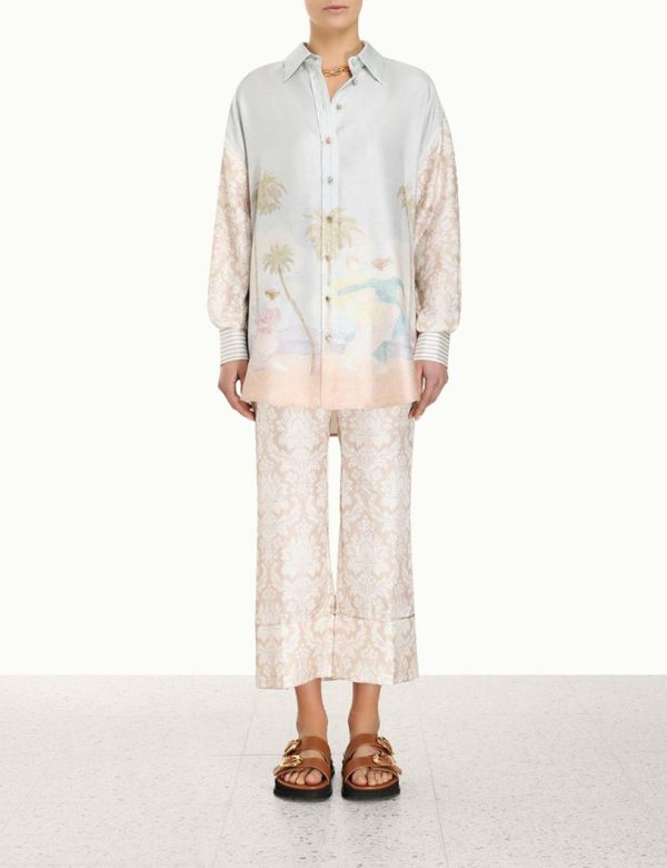 The Sensory Kick Flare in Beige Damask from our Fall 2023 Collection, Luminosity. A silk twill pant featuring a damask print and an elasticated back waist.
