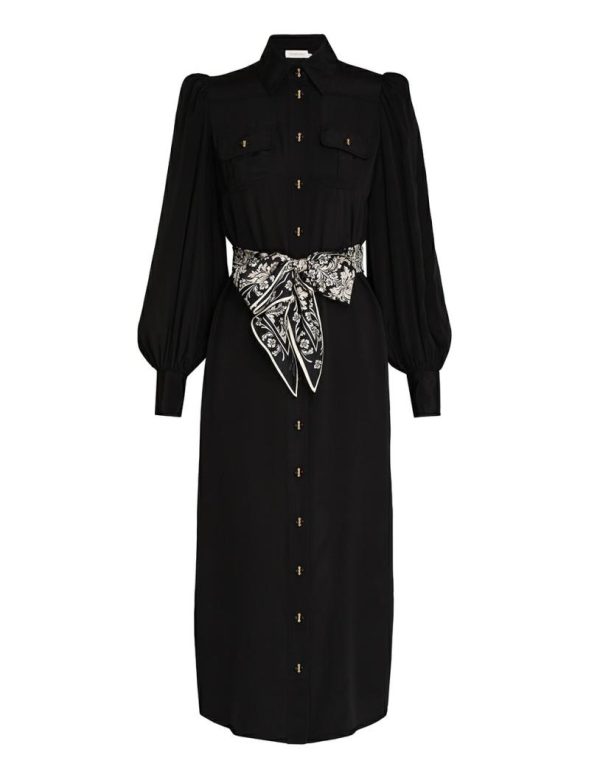The Shirt Midi Dress in Black from our Fall 2023 Collection, Luminosity. A shirt style midi dress featuring blouson sleeves and contrast binding throughout.