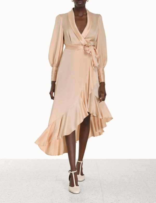 The Silk Wrap Midi Dress in Sand from our Fall 2023 Collection, Luminosity. A silk midi dress featuring a wrap front silhouette, blouson sleeves with elongated cuffs and asymmetric skirt.