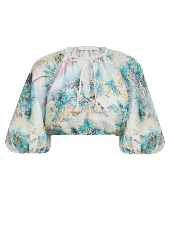 Zimmermann Vacay Puff Sleeve Crop Top Blue Multi | Women Tops